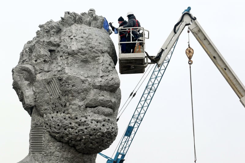 Lüpertz bemalt auf dem Gelände der ehemaligen Zeche Nordstern in Gelsenkirchen seine Herkules-Skulptur.