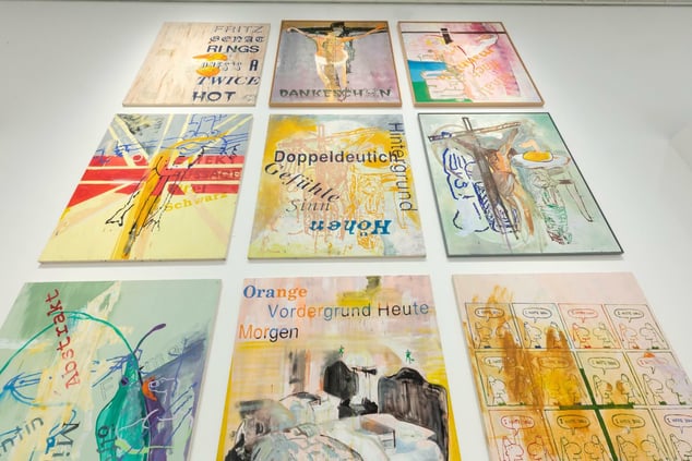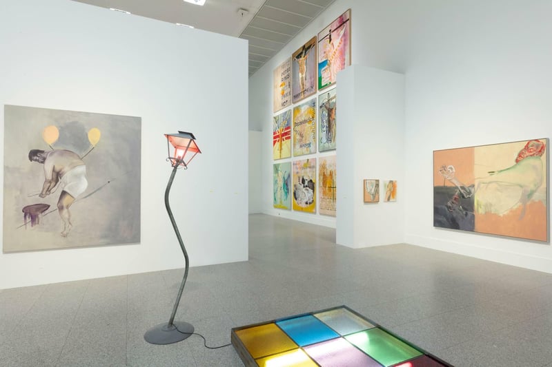 Blick in die Ausstellung „Bitteschön Dankeschön“ in der Bundeskunsthalle Bonn: Im Vordergrund stehen die „Laterne an Betrunkene“ (1988) und die „Hühnerdisko“ (1988). Im Hintergrund links ist eines der bekannten Unterhosen-Bilder „Ohne Titel (Selbstporträt)“ von 1988 zu sehen.