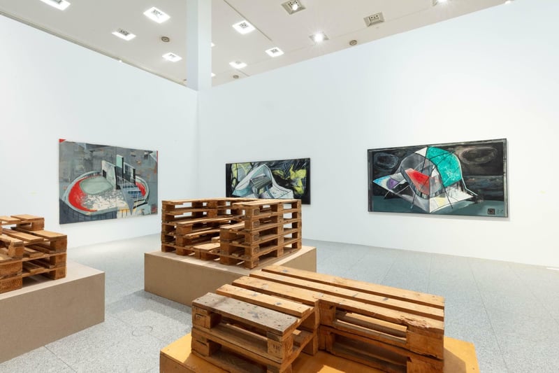 Blick in die Retrospektive in der Bundeskunsthalle in Bonn mit dem „Entwurf für ein Müttergenesungswerk in Gütersloh“ (Mitte hinten) und Paderborn (vorne), beide 1985 entstanden. Die drei Gemälde stammen aus den Jahren 1984 und 1985.