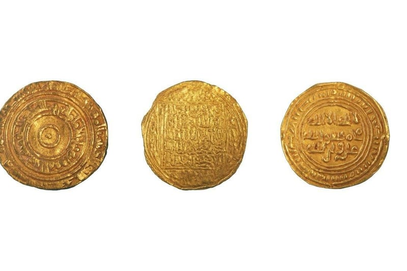 Mehr als 1000 Jahre islamische Kultur spiegeln die Münzen aus dem Clan der Al Thanis. Von li.: Golddinar aus dem 10. Jahrhundert aus dem Kalifat der Fatimiden, Gold-Münze aus der im 14. und 15 Jahrhundert herrschenden Berberdynastie der Mariniden und ein Goldstück, das zur Zeit des Sulayhiden-Herrschers Achmad B. Ali im 11. Jahrhundert auf dem heutigen Territorium des Jemen geprägt wurde.