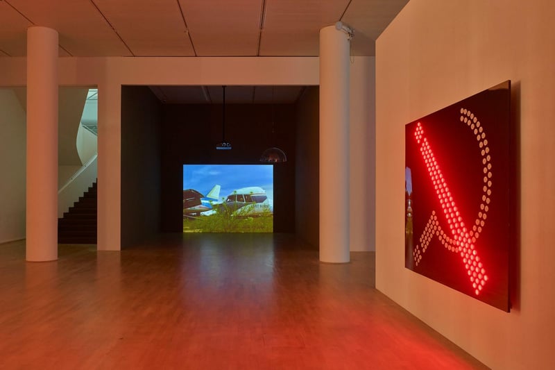 Blick in das zentrale Foyer der Ausstellung im Ständehaus. Die erwähnte Lichtskulptur „Marks“ (2010) befindet sich im Bild rechts. Im Hintergrund läuft die Videosequenz „Lost Birds“ (2005).