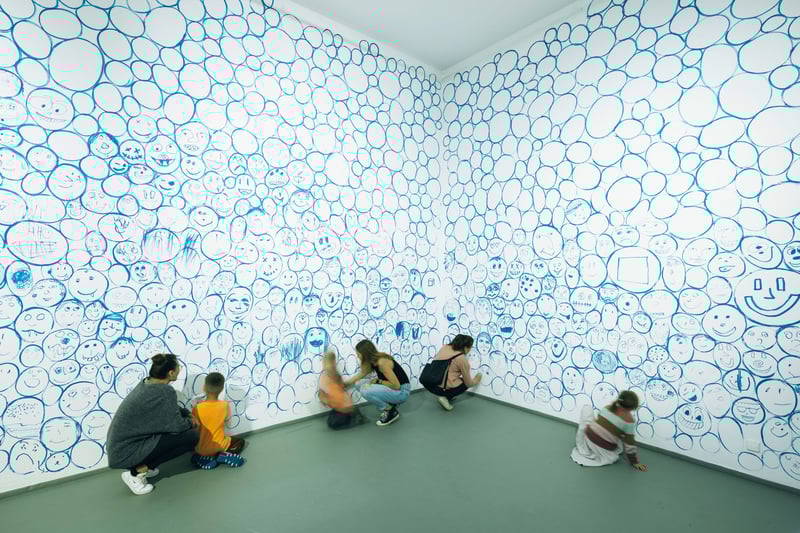 Experimentell und interaktiv sind im Japanischen Palais Jeppe Heins blaue Kreise angelegt. Ackermann: „Kinder dürfen sie mit mimischem Ausdruck füllen. Und sich so ihre eigene Stimmung bewusst machen. Für sich und alle Besucherinnen und Besucher werden sie sichtbar als Individuum.“ Die ganze Ausstellung dreht sich um das Mitgestalten, um die Selbstermächtigung der Kinder.