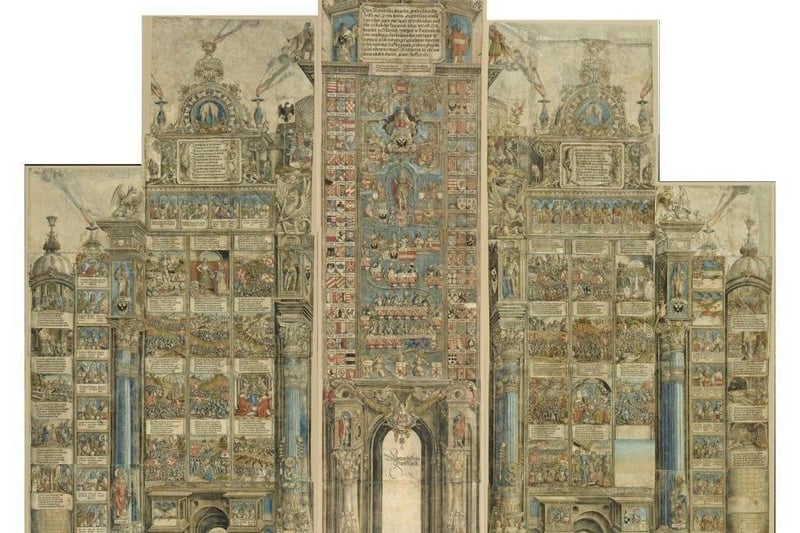 Die in Holzschnitttechnik von 195 Druckstöcken auf 36 Papierbögen gedruckte „Ehrenpforte für Kaiser Maximilian I“ hängt in zwei Versionen in der Schau. Das im Osten bewahrte Exemplar ist alt koloriert, während das 1556 posthum gedruckte, 1971 für die West-Sammlung erworbene Hauptwerk mit schwarzer Tiefenwirkung prunkt. Es ist ein Repräsentationswerk, das vor allem durch seine Monumentalität besticht. Die subtile Feinarbeit und zeitlose Wirkung der Zeichnungen vermag es nicht zu überstrahlen.