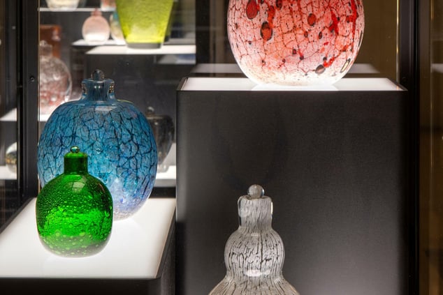 Die Glasarbeiten kommen in von oben und unten beleuchteten Vitrinen voll zur Geltung.