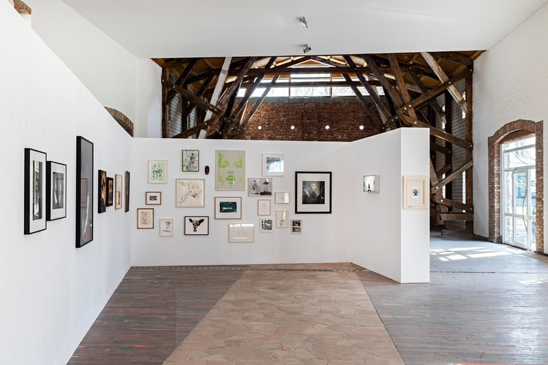 Für die Porträt-Ausstellung ist eine der beiden Scheunen durch den Einbau einer schräg angeordneten Stellwand zu einer richtigen Kunsthalle geworden. An der Wand sind kleinere und größere Formate in Gruppen mit Petersburger Hängung angeordnet.