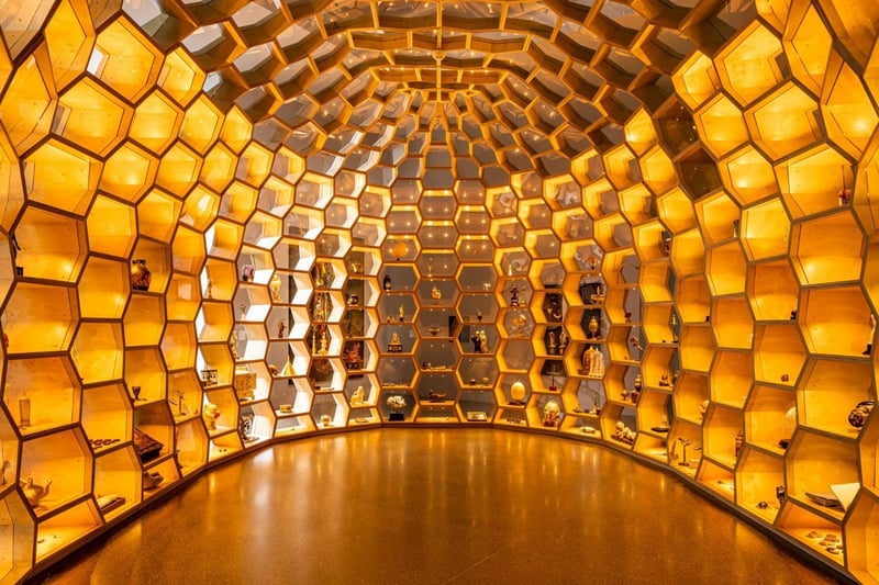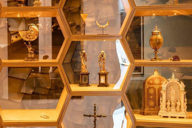Etwa 220 der wertvollsten und seltensten Objekte der Kunst- und Wunderkammer hat Thomas Olbricht behalten. Ausgestellt sind sie als Leihgabe im Museum Folkwang in Essen. Dort kommen sie gleich von zwei Seiten zur Geltung. Denn das kubanische Künstlerduo Los Carpinteros hat die raumfüllende Vitrine so gebaut, so dass man drumherum laufen kann. Die gebogene Großvitrine ist selbst ein Kunstwerk. Sie heißt „Helm“ und beschützt mit zahlreichen kleinen Vitrinen die fragilen Kostbarkeiten.
