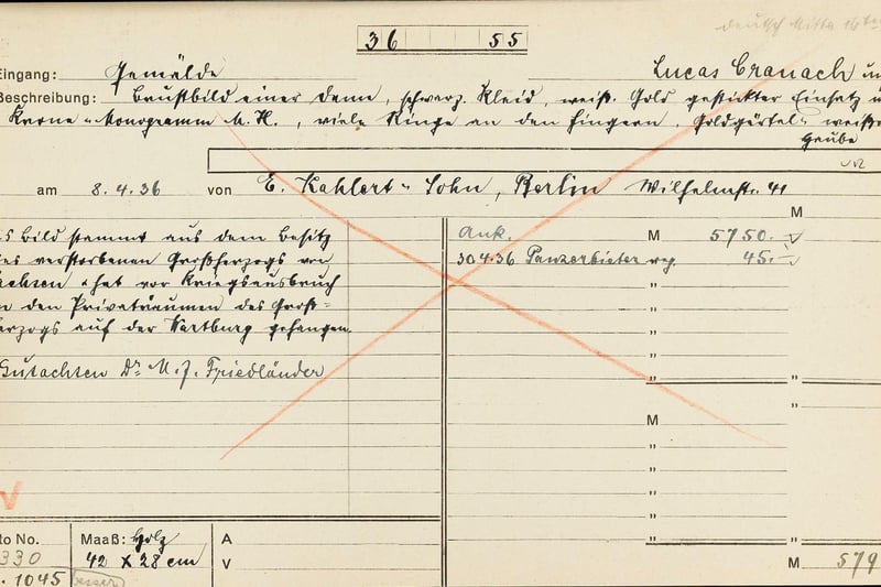 Die historische Karteikarte der Kunsthandlung Böhler dokumentiert den Ankauf des damals mit Gutachten Lucas Cranach zugeschriebenen Damenporträts.