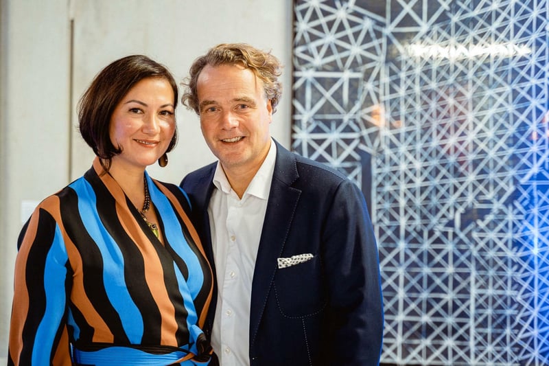 Die Gastgeber des Salons vor einem Gemälde von Shannon Bool.
