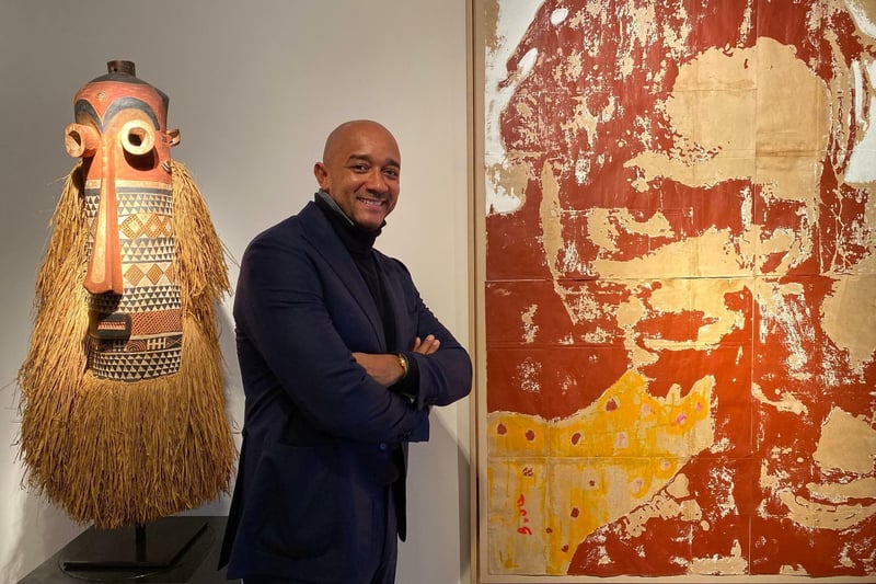 Der Galeriegründer steht zwischen einer Maske der Pende aus dem Kongo und dem unbetitelten Gemälde von Armand Boua.