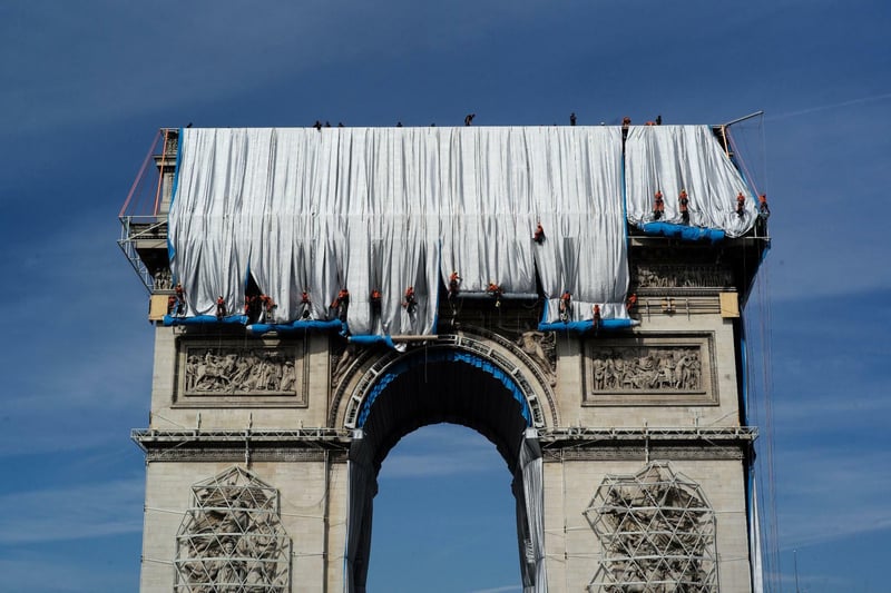 Normalerweise grau in grau, ragt der Triumphbogen sechzehn Tage lang wie ein faszinierend imposantes, blau-weiß-rotes Kunst-Gletschergebirge gen Himmel. Ganz im Sinne des Künstlerpaars verfremdet die Verpackung das Mahnmal und wertet es auf. Die Farben der französischen Flagge unterstreichen die symbolträchtige Bedeutung von Christos Projekt.