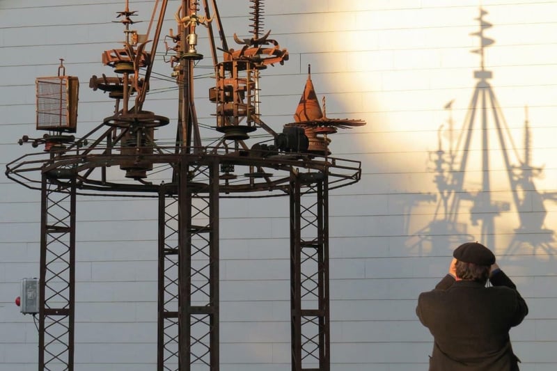 Mit der typischen Baskenmütze auf dem Kopf fotografiert der Künstler das Schattenspiel der Skulptur „Holy Prong“ (2014), eine Art kinetische Pagode auf vier Tragmasten.