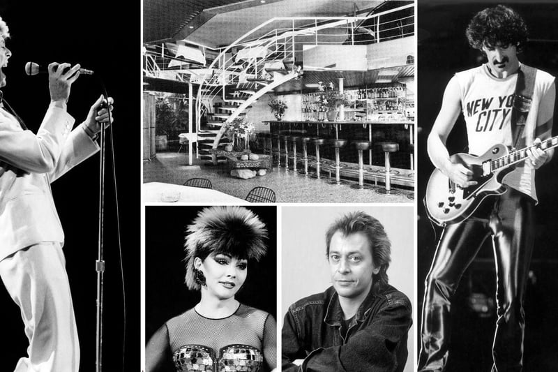 Bildkombo mit prominenten Gästen des „Dschungels“. David Bowie (l), Frank Zappa (r), Romy Haag (unten, l) und Rio Reiser.