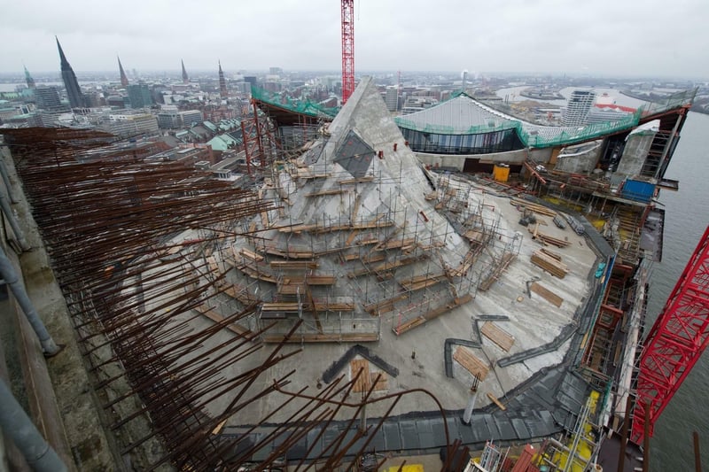 Die Dachkonstruktion mit der obersten Kuppel des Großen Konzertsaals auf der Baustelle der Elbphilharmonie.