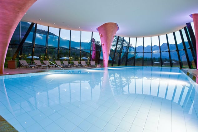 Das Spa bietet einen schönen Blick auf die umliegenden Berge – vielleicht eher nicht, wenn man ganz allein ist.