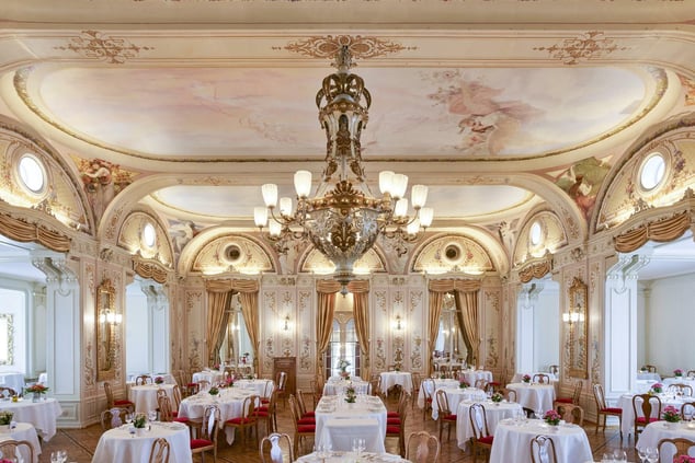 Von hier bricht der Hoteldirektor jeden Abend gegen 19 Uhr auf, um in dem hufeisenförmigen Hotelpalast nach offenen Türen oder laufenden Wasserhähnen zu sehen. Der dunkelblaue, mit Rosetten verzierte Teppich führt die Treppen hinauf ins Restaurant, wo antike Götter auf Deckenfresken tanzen. Er führt weiter hinab zum Weinkeller, wo neben vier Meter hohen Fässern ein Paar uralter Holzski mit dem Namensschild eines Mr. Davidson hängen, der sie nach einer Langlauf-Saison vor vielen Jahrzehnten hier ließ und nie mehr abholte.