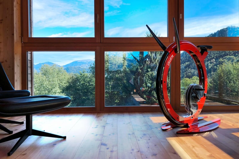 Das „Ciclotte Bike Steel“ soll Fitnessgerät und Wohnaccessoire in einem sein. Darum rotiert das Rad ganz ohne Speichen inmitten eines ringförmigen Stahlrahmens. Die Blicke können durch das Objekt hindurch wandern, das wiederum mit leuchtenden Farben selbstbewusst Akzente setzt.