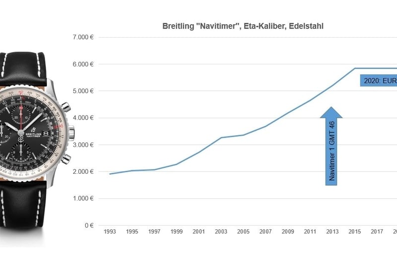 Vor rund 25 Jahren gab es den stählernen, 38 Millimeter großen Navitimer ’92 mit Eta-2824-Automatik und Chronographen-Modul von Kelek für rund 2430 Euro. Im aktuellen Nicht-Manufaktur-Navitimer tickt das Automatikkaliber Valjoux 7750 oder das SW 500 genannte Pendant von Sellita. Erkennbar an den senkrecht angeordneten Totalisatoren und dem Fensterdatum bei „3“. Der Preis liegt bei rund 5800 Euro.
