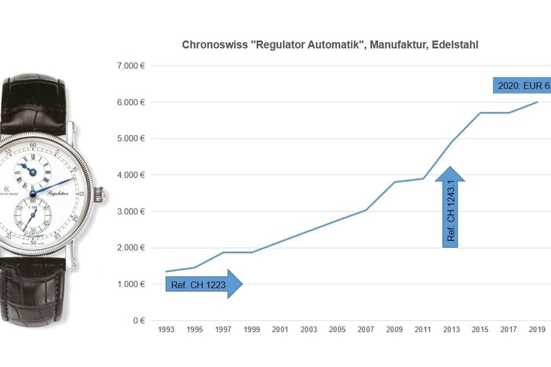 Hinreichend Geduldige können und dürfen sich jedoch auch bei ganz Normalem über merklichen Wertzuwachs freuen. Er resultiert unter anderem aus regelmäßigen Preissteigerungen unter anderem durch Inflation, Lohnzuwächse, gestiegene Materialkosten, Optimierungen oder veränderte Währungsparitäten. In diesem Sinne haben sich die Preise auch in der Uhrenindustrie in den vergangenen 25 Jahren mehr als verdoppelt.