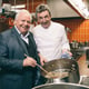 Zusätzliche Aufmerksamkeit besorgen die Fernsehmoderatoren Ruth Moschner und Jochen Schropp. An jenem Montag ist die Presse geladen, und wird gleich verpflichtet mitzukochen. In die lockere Grundstimmung bringt Schudel immer wieder Schärfe. Er ist Inhaber zweier Schweizer Spitzenrestaurants in Unterseen bei Interlaken. Sein „Benacus“ ist im Guide Michelin geführt. Die Ansagen des Küchenchefs sind deutlich, aber nicht im Ton daneben. Alles, was getan werden soll, passiert am besten schnell. Erst als das Essen auf dem Tisch steht, entspannt der 40-Jährige, der verschiedene Kochsendungen beim Schweizer Pro Sieben betreut. Er betont das Wort Sendung, es ginge nicht um Show. Und er findet Zeit, sich bei drückenden Temperaturen auf ein Gespräch in die Abendluft zu setzen.