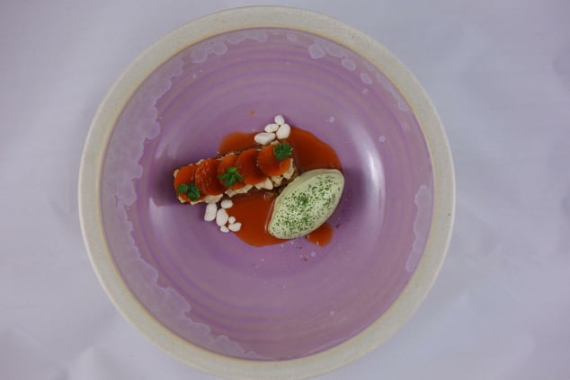 Er besteht aus bis zu 20 Komponenten - unter anderem Teltower Rübchen, Kapuzinerkresse, Forellenschluss, Crapaudine und geräucherter Buttermilch.