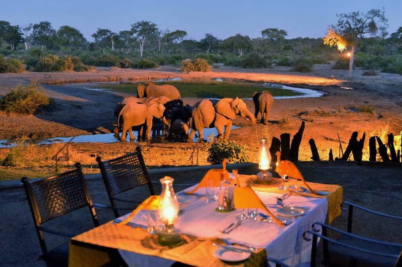 Zum Abendessen dürfen die Gäste auf ihren Logenplätzen am Wasserloch Platz nehmen – langweilig wird es dort nie.
