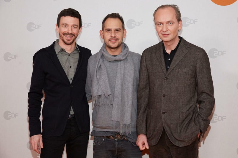 Der Produzent Oliver Berben (v.l.n.r.), der Schauspieler Moritz Bleibtreu, der den Berliner Anwalt Friedrich Kronberg spielt, und der Rechtsanwalt und Schriftsteller Ferdinand von Schirach bei einem Pressetermin anlässlich der Serie „Schuld - nach Ferdinand von Schirach“.