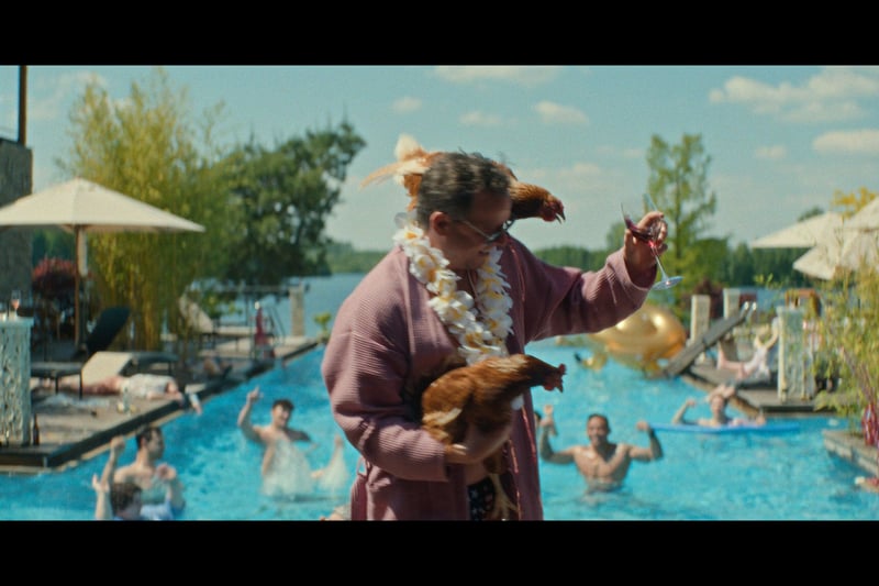 Matthias Brandt als Magnus A. Cramer in „King of Stonks“ bei einer Poolparty.