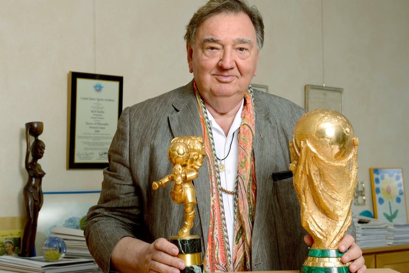Unternehmer Rolf Deyhle mit Kopien der Fifa-Trophäen Fair Play und Weltpokal, die er als Anerkennung für seine Verdienste um den Weltfußball erhielt.