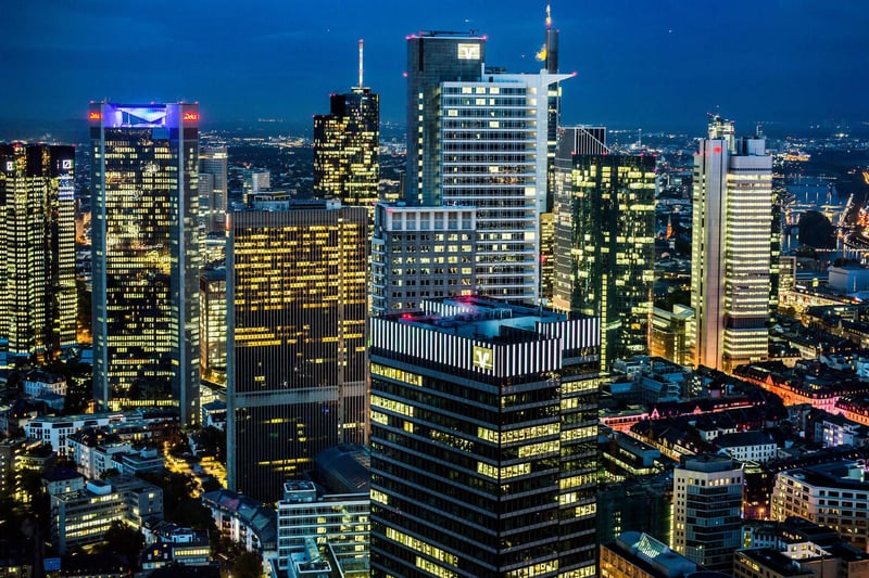 Farbenfroh erscheint die Stadt mit ihren Hochhäusern zur abendlichen Blauen Stunde: Frankfurt ist biertrinkerfreundlich. Dennoch kostet das Bier hier 0,74 Euro im Supermarkt und ein durchschnittlicher Preis von 4,95 Euro in der Bar. Das geht im deutschen Vergleich deutlich günstiger.