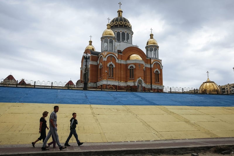 Die Nationalflagge der Ukraine vor einer Kirche in der Hauptstadt Kiew: Das Bier sprudelt in Osteuropa besonders billig. 0,87 Euro für ein Flasche Bier im Supermarkt, das ist fast unschlagbar. In der Bar sind es dann immerhin 2,10 Euro. Das macht einen Durchschnittspreis von 1,49 Euro.
