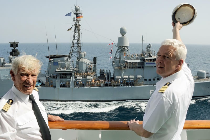 Der Kapitän der „MS Deutschland“, Andreas Jungblut (rechts, hier mit „Traumschiff“-Filmkapitän Siegfried Rauch) hat angeblich keine Erlaubnis mehr an Bord seines Schiffes zu gehen.