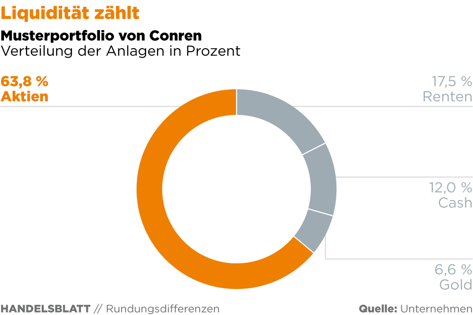 Johannes von Salmuth bezeichnet sich als risikoavers. Ängstlich sei er nicht, die Leitidee der Geldanlage sei die „Enkelfähigkeit“, also der langfristige Erhalt des Vermögens für die kommenden Generationen. Umgesetzt wird die Strategie von Altrafin mit Hilfe von Fonds, Flaggschiff ist der „Conren Fortune“-Fonds. Seine Allokation sieht aktuell so aus: Die Rentenquote beträgt ungefähr 17 Prozent, der Barbestand macht rund zwölf Prozent aus. Gold trägt etwa sieben Prozent zum Portfolio bei, der Löwenanteil entfällt mit 63 Prozent auf Aktienanlagen. Ein Drittel der Aktienanlagen wird durch S&P-500-Futures abgesichert, Derivate spielen also eine wichtige Rolle. Netto liegt die Aktienquote bei 40 bis 45 Prozent.