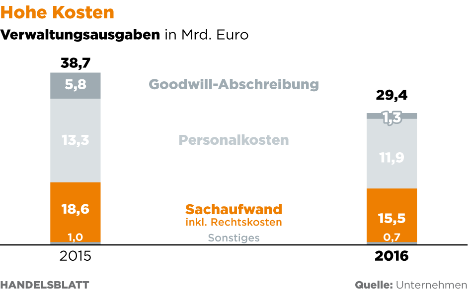 2016 summierten sich die nicht zinsabhängigen Kosten auf 29,4 Milliarden Euro. Das waren zwar deutlich weniger als die 38,7 Milliarden aus dem Vorjahr, aber 2015 hatten milliardenschwere Abschreibungen und Rechtskosten von 5,2 Milliarden Euro auch zu einem Rekordverlust von 6,8 Milliarden Euro geführt. Für die lange Liste der Skandale wurden 2016 „nur noch“ 2,4 Milliarden Euro fällig. Daneben ließen deutlich geringere Firmenwertabschreibungen und ein geschrumpfter Personalaufwand die Kosten schmelzen. Aber gerade diese Entwicklung wird sich nicht ohne weiteres fortschreiben lassen. Denn der Hauptgrund für die um elf Prozent gesunkenen Personalaufwendungen waren deutlich niedrigere Boni. Das Institut hatte den Löwenanteil der variablen Vergütung für 2016 zusammengestrichen. Das lässt sich nicht beliebig wiederholen, zu sehr fürchtet die Bank die Flucht von Leistungsträgern. „Wir planen, 2017 zu unseren normalen Vergütungsprogrammen zurückzukehren“, beschwichtigte der Vorstand seine Angestellten im Geschäftsbericht.