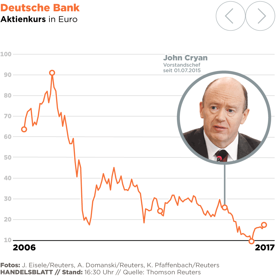 Die richtige Diagnose stellte Cryan gleich zu Beginn seiner Amtszeit: Die Bank habe eigentlich kein Strategie-, sondern ein Umsetzungsproblem. Das sehen die einflussreichsten Großaktionäre, die Herrscherfamilie des Scheichtums Katar und der chinesische Konzern HNA, genauso. Die beiden Gruppen, die jeweils knapp zehn Prozent an der Bank halten, stärken dem Management zwar den Rücken und haben das auch bei der jüngsten acht Milliarden Euro schweren Kapitalerhöhung bewiesen.