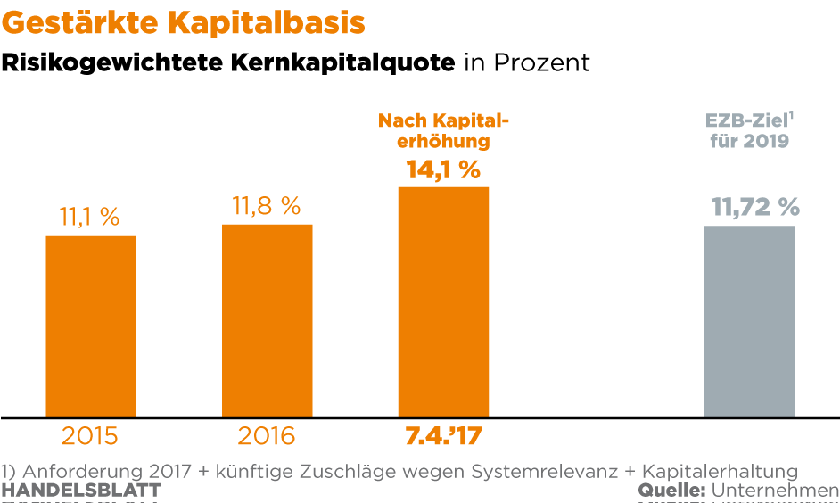 Zu der günstigeren Kapitalquote hat auch beigetragen, dass die Bank riskante Vermögenswerte in ihrer Bilanz abgebaut hat. Die sogenannten risikogewichteten Aktiva, also die nach ihrem Risikogehalt gewichteten Bilanzposten der Bank, sind im vergangenen Jahr um rund zehn Prozent auf 358 Milliarden Euro geschrumpft.
