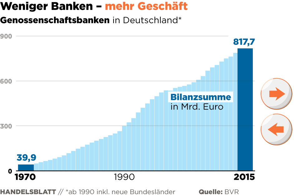 „Fusionen sind keine Lösung“, findet der langjährige Genossenschaftsbanker. Damit widerspricht er Dutzenden Volks- und Raiffeisenbanken, die gerade zusammengehen oder kurz davor stehen. Ihre Zahl ist jüngst unter 1.000 gerutscht, auf 994. Insgesamt an die 50 Fusionen wird es dieses Jahr geben, erwartet der Branchenverband BVR.