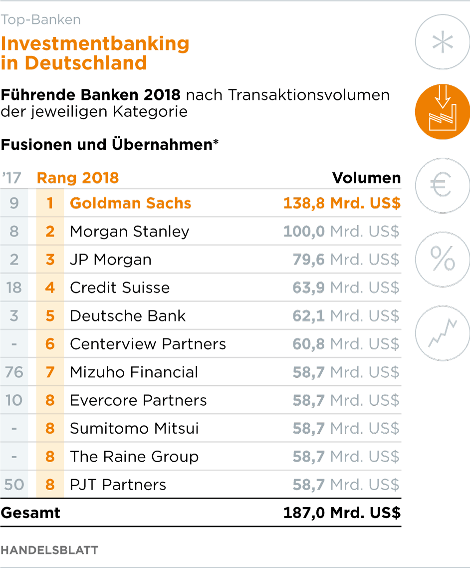 Für die Investmentbanker ist das alles ein Grund zum Jubeln. Bei ihnen klingeln die Kassen. Mit 118,4 Millionen Dollar hat JP Morgan 2018 in Deutschland am meisten eingenommen (siehe Grafik), gefolgt von der Deutschen Bank. Insgesamt haben die Banken bereits im ersten Halbjahr 1,3 Milliarden Dollar an Provisionen bei M&A, Aktien- und Anleiheemissionen sowie Krediten verdient. 2018 verspricht ein Spitzenjahr zu werden.