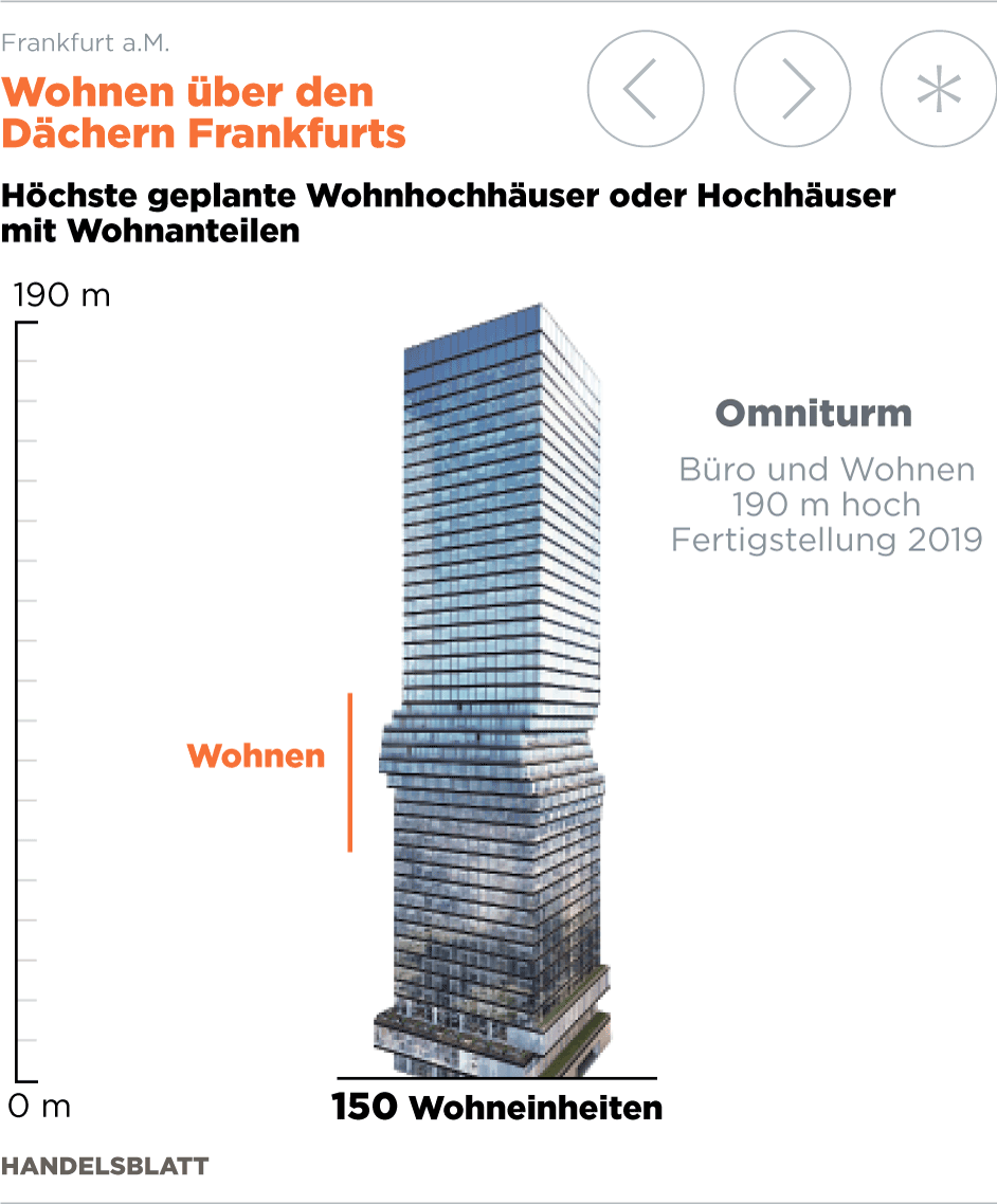 Foto: HaP Frankfurt GmbH & Co. KG und RFRFrankfurts Planungsdezernent Mike Josef (SPD) gibt sich keinen Illusionen hin: „Die Wohnhochhäuser sind kein zielführender Lösungsansatz für bezahlbaren Wohnraum“, sagt er dem Handelsblatt. Er glaubt offenbar nicht an einen nennenswerten Kaskadeneffekt. So beschreiben Marktforscher den Prozess, in dem Menschen nach wirtschaftlichem Aufstieg in komfortablere, hochpreisige Wohnungen wechseln und dadurch günstige Wohnungen für Einkommensschwächere frei machen.