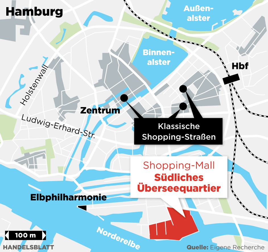 Doch das neue Center galt vielen potenziellen Investoren als risikoreich. Die Stadt forderte offene Straßenflächen statt einer klimatisierten Mall und wollte die Verkaufsfläche begrenzen, um die gewachsene Innenstadt zu schützen. Dazu kommt: Anders als etwa im Ruhrgebiet gibt es im Hamburger Umland keine weiteren Großstädte. Die Hoffnung gründet sich daher auch auf Touristen – doch ob die wirklich in großer Zahl kommen, ist ungewiss.