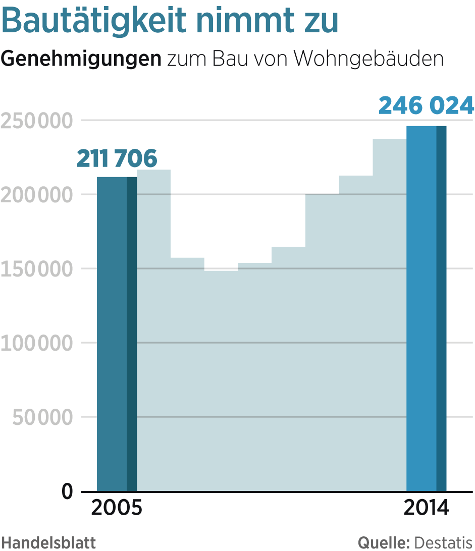 Die Auftragsbücher der auf Wohnungen und Einfamilienhäuser spezialisierten Firmen sind prall gefüllt. Um weitere fünf Prozent auf 38,4 Milliarden Euro soll der Umsatz in diesem Segment 2016 zulegen. 290 000 neue Wohnungen kommen neu auf den Markt, schätzt der Verband. Das sind 80 Prozent mehr als im Jahr 2011.