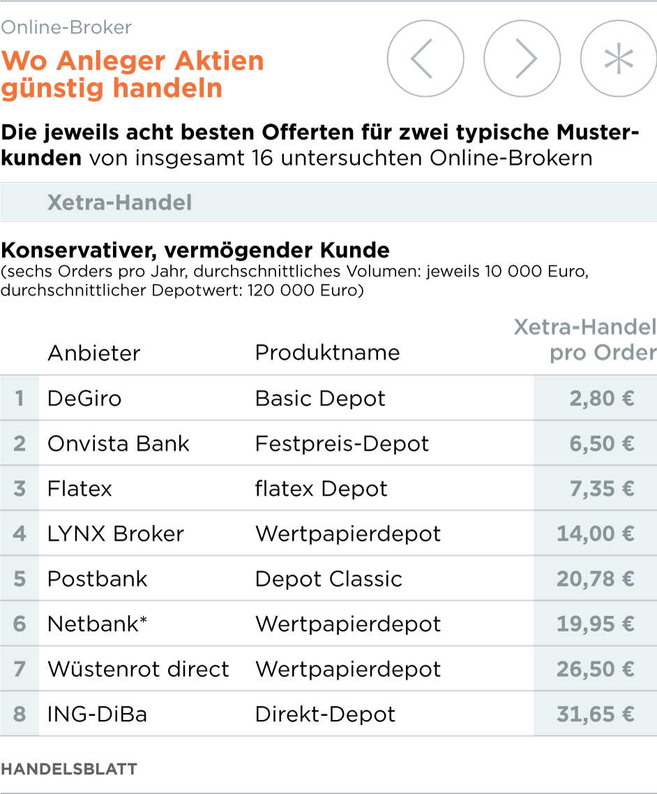 Um konkret Kosten zu vergleichen, hat FMH einige typische Fälle konstruiert. Der erste Musterkunde ist ein konservativer vermögender Anleger mit durchschnittlich 120. 000 Euro im Depot. Er platziert sechs Orders pro Jahr, mit einem durchschnittlichen Volumen von jeweils 10.000 Euro. Beim Handel über Xetra ist der niederländische Broker DeGiro für diesen Kunden mit Abstand der günstigste Anbieter. Pro Order werden dort nur 2,80 Euro fällig. Auf das Jahr gerechnet zahlt der Kunde also 16,80 Euro.