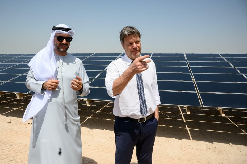 Der Bundeswirtschaftsminister besuchten eine großflächige Solaranlage in der Nähe vom nachhaltigen Städtebauprojekt Masdar City.