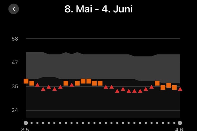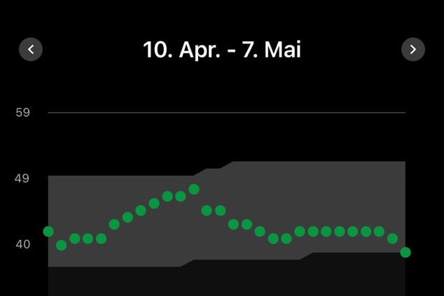 Aber nicht immer spüre ich so präzise, dass ich nicht ganz fit bin, und dann lässt sich zumindest ein sehr niedriger Wert nutzen, um sich zu prüfen: War es zu lang am Vorabend? Ist das leichte Halskratzen oder die laufende Nase doch schon eine heraufziehende Erkältung?