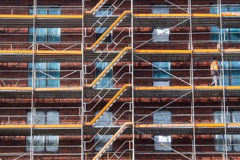 Bauarbeiter arbeiten am Neubau eines Mehrfamilienhauses im städtebaulichen Großprojekt Wasserstadt Limmer.