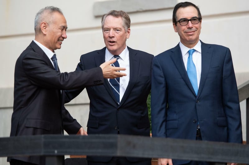 Finanzminister Steven Mnuchin (r) und Handelsminister Robert Lighthizer begrüßen den chinesischen Vizepremier Liu bei einem Treffen in Washington.