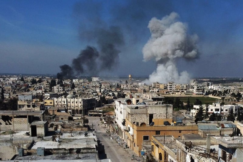 Rauchwolken über der Stadt Saraqib in der syrischen Region Idlib