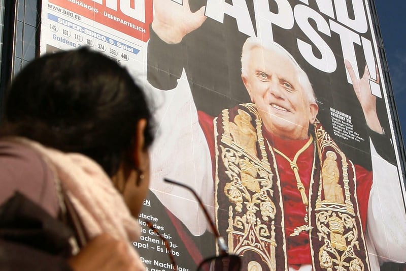 Nur eine von vielen Schlagzeilen, die Geschichte schrieb: Ein riesiges Plakat an der Fassade des Axel-Springer-Hochhauses, das Papst Benedikt XVI auf einer Titelseite der „Bild“ zeigt.