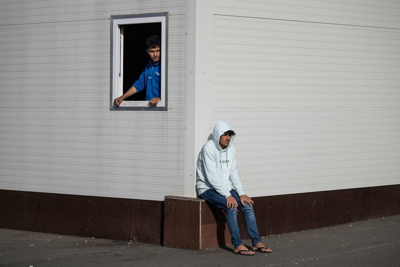 Zwei Männer warten in der hessischen Erstaufnahmeeinrichtung (HEAE) in Gießen. Hier sind derzeit rund 3500 Menschen aus unterschiedlichen Ländern untergebracht, die von hier aus auf kommunale Einrichtungen verteilt werden.