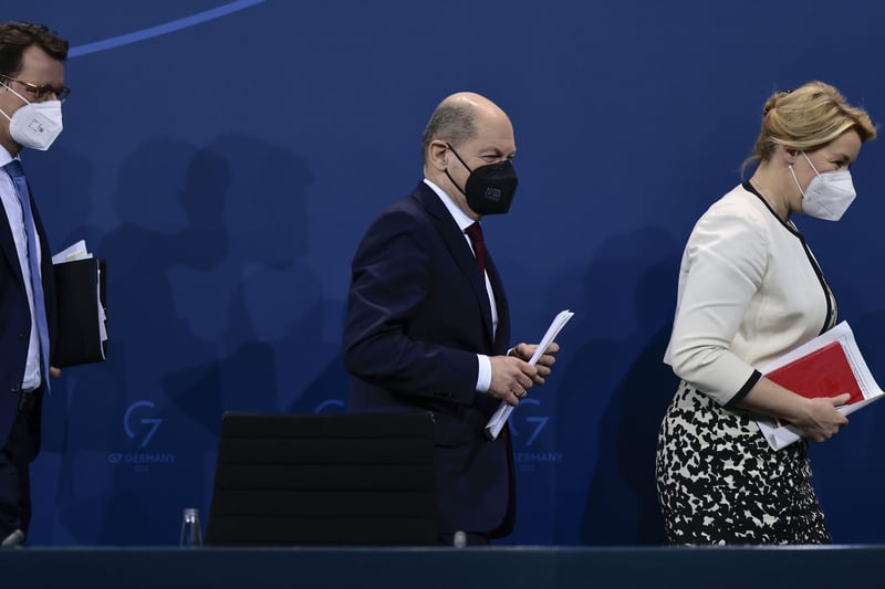 Bundeskanzler Olaf Scholz (SPD, Mitte), Hendrik Wüst (CDU), Ministerpräsident von Nordrhein-Westfalen, und Franziska Giffey (SPD), Regierende Bürgermeisterin von Berlin, wollen beim kommenden Treffen am Mittwoch einen Öffnungsplan beschließen.