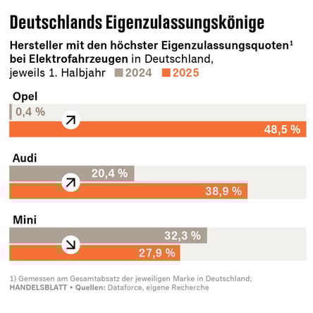 Spitzenreiter ist dabei Opel, die mit einem Wert von 48,5 Prozent fast jedes zweite produzierte Elektromodell zuerst auf sich selbst zulassen, gefolgt von Audi und Mini.